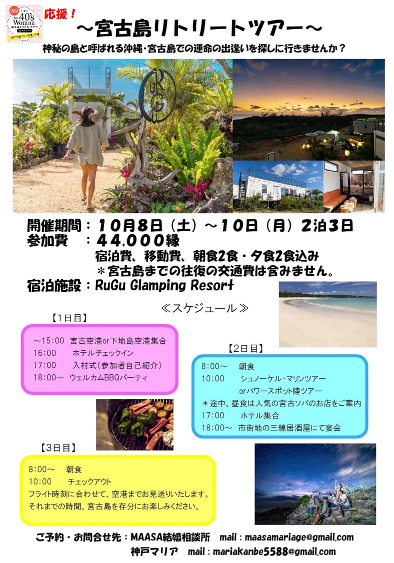 10/8(土)~10(月)2泊3日! 沖縄宮古島リトリートツアー❤ ★男女の出逢い会(女性限定)★ 沖縄好きの方のための婚活会! 神秘の島「宮古島」で運命の出会い旅! 沖縄メンズが貴女をお待ちしています!