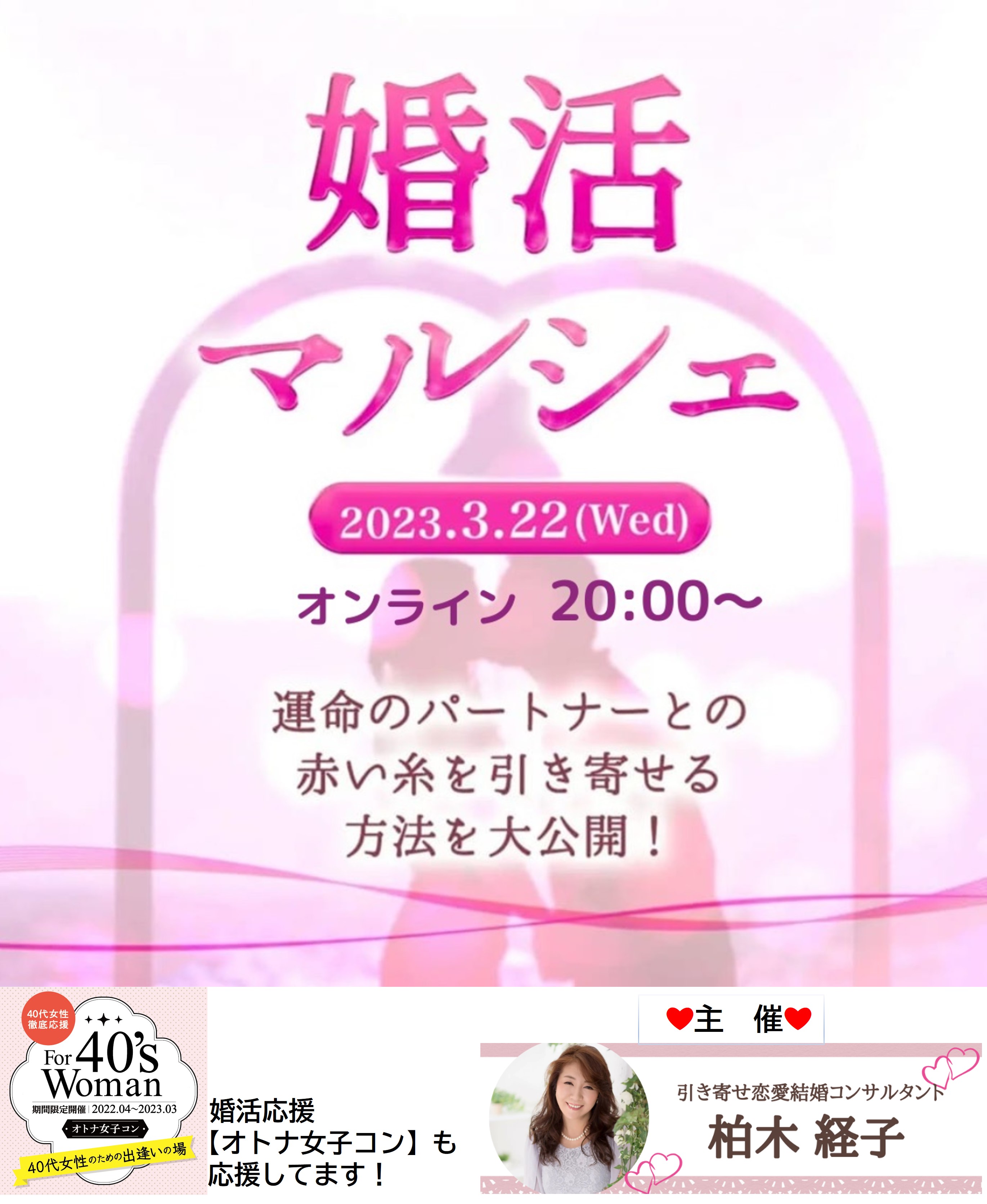 婚活のプロが多数集結!「婚活に役立つ」150分 運命のパートナーとの赤い糸を引き寄せる方法を大公開! 主催/引き寄せ恋愛結婚コンサルタント 柏木経子 会場/ZOOMオンライン 会費/無料 対象/婚活・結婚に興味・関心のある方 お申込み・問合せ https://activepage.jp/events?event=322&br=9272