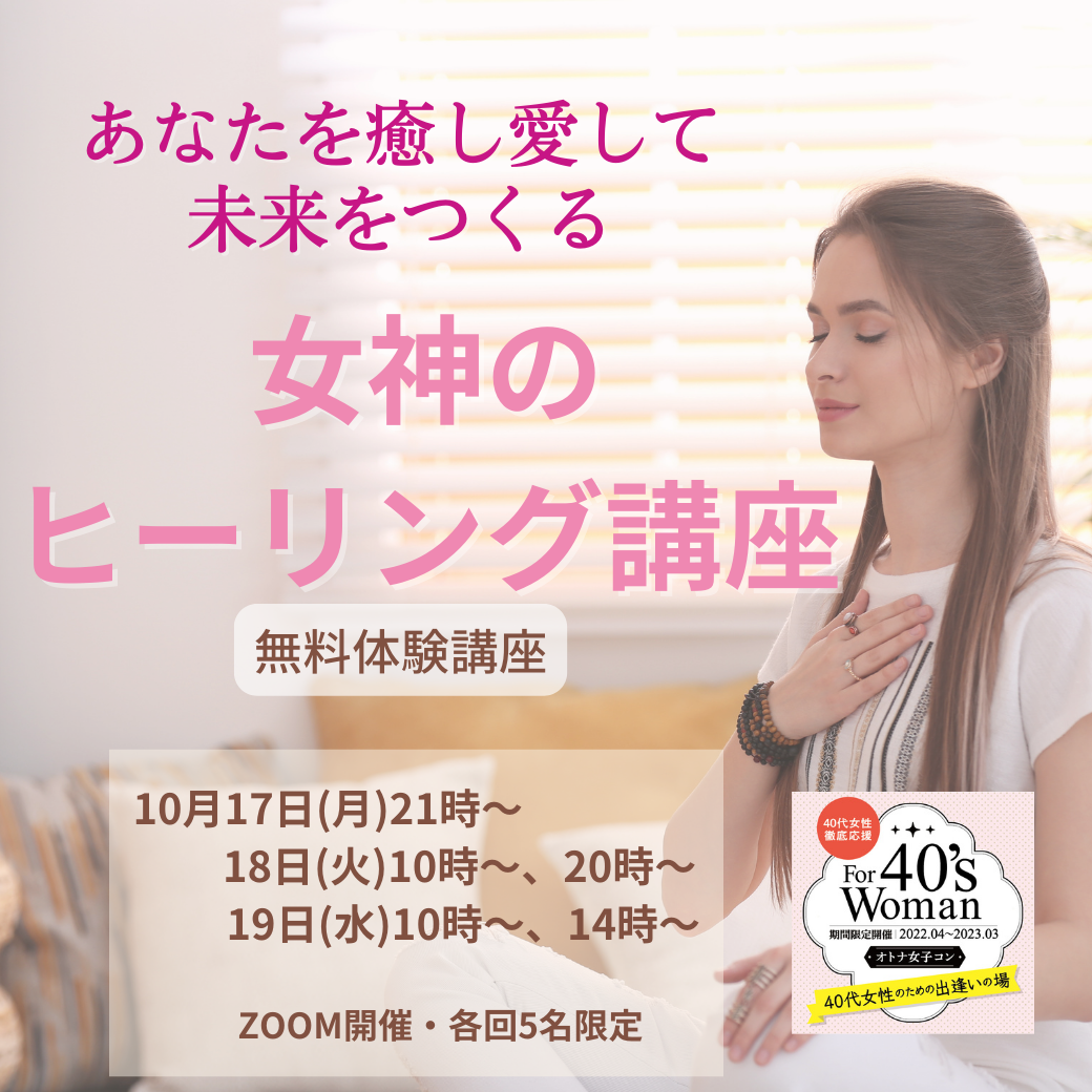 10/17(月)21:00-22:00 10/18(火)10:00-11:00、20:00-21:00 10/19(水)10:00-11:00、14:00-15:00 あなたを癒し愛して未来をつくる女神のヒーリング無料体験講座