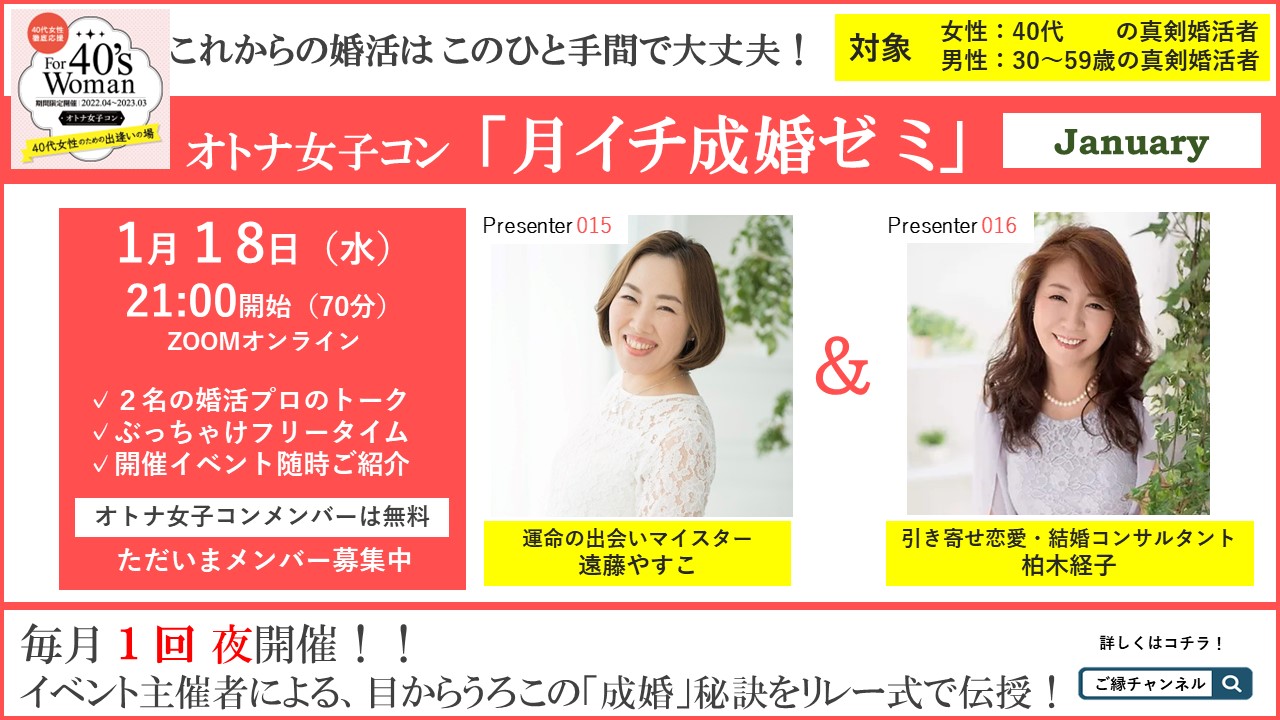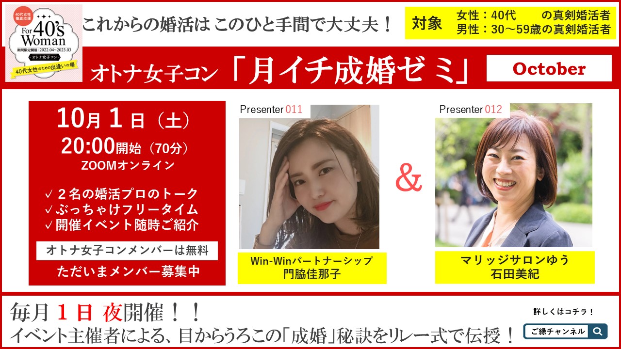参加費無料 ・毎月1日夜開催(70分) ・オンライン ・2名出演者のよるワークショップ体験会 ・イベント情報お届け 主催:オトナ女子コン主催メンバー 出演: Win-Winパートナーシップ/門脇佳那子 マリッジサロンゆう/石田美紀 会場:ZOOMオンライン 対象: 女性/40代 男性/30~59歳 参加費:無料 詳細・申込はコチラ https://eventlink.jp/ent/1nms83lf