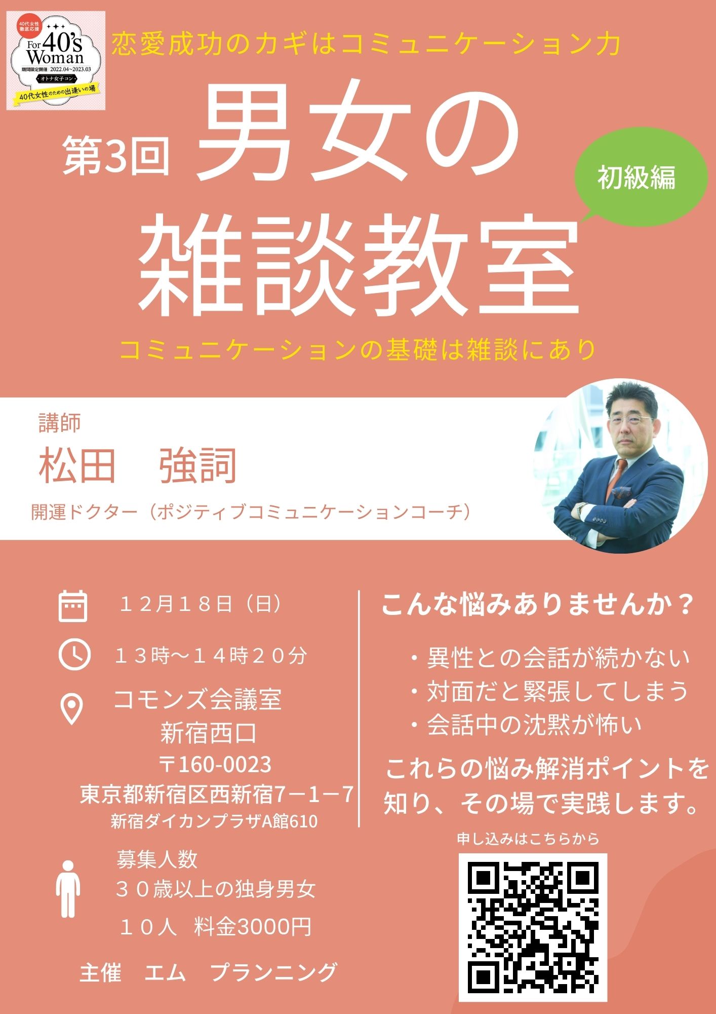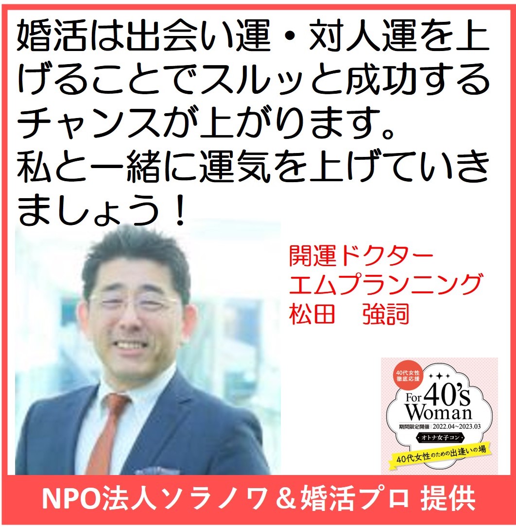 ★婚活スキルアップ★ 異性との会話に困ったことはありませんか?雑談力を鍛えてコミュニケーション上手になろう! 主催/エム プランニング 主催者メッセージ 会場/コモンズ会議室 新宿西口 対象/30歳以上の婚活男女 定員/男女各5名 参加費(税込)/3,000円 ※オトナ女子コンメンバー特典 オンライン婚活コンサル30分無料(通常5000円)をお付けします! お問合せはコチラ 松田つよし