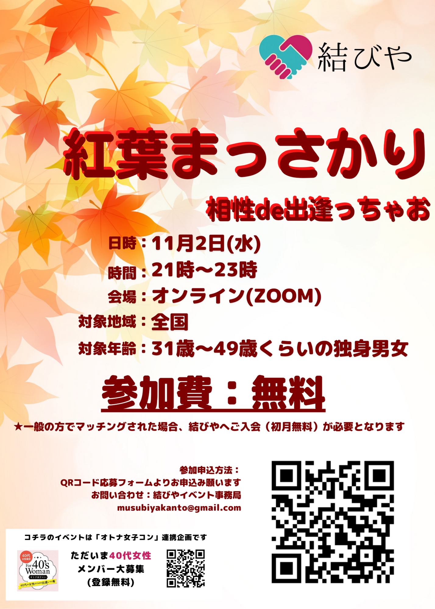 対象:31~49歳くらいまでの独身男女 ※オトナ女子コンメンバー特典 30分オンライン相談+近未来カード占い 会費:無料 問い合わせはコチラ musubiyakanto@gmail.com 申込みはコチラ https://ws.formzu.net/sfgen/S29575009/