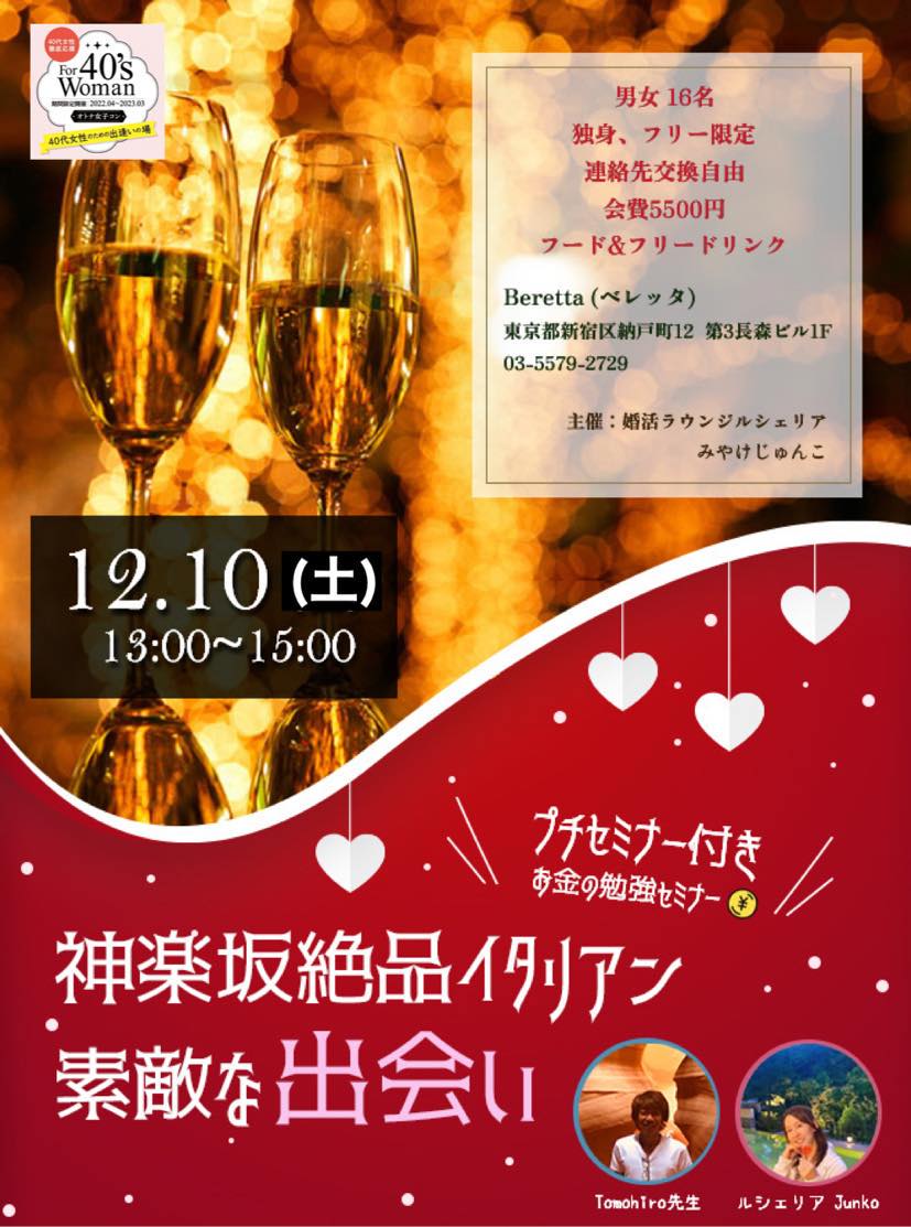 ソムリエの解説付きのワイン会です。独身イベント!40代女性を中心に参加者を募ります! 主催:婚活サロンケンマリアージュ 主催者メッセージ 会場/中央区八丁堀マンション ※参加者に後日お知らせします! 対象/女性:40代 男性:不問(年相応) ※年齢で気になる方はお問合せを! 定員:男女各5名(最小催行人数:8名) 参加費/女性:4500円 男性:5500円 ※オトナ女子コンメンバーは500円割引! 詳細はコチラ